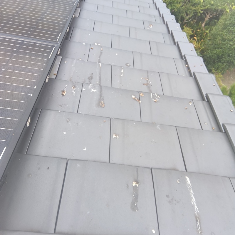 愛知県豊橋市岩屋町の戸建て住宅にお住まいのお客様から、鳩対策のご相談をいただきました。 屋根に設置された太陽光パネルの下に鳩が住み着き、ベランダまで被害がおよんでいるとのことでした。 現地調査をおこなったところ、太陽光パネル周辺の屋根には多数のフンが付着しており、衛生的な問題だけでなく、パネルの発電効率への影響も懸念される状態でした。 以前に設置した資材がすべて取れてしまったという経緯もあり、今回はより確実で耐久性の高い施工を希望されました。