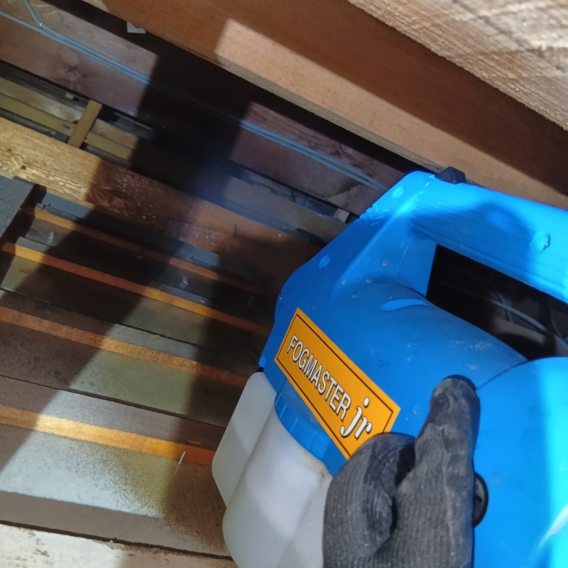 仕上げの工程として、ネズミに寄生していたイエダニなどの二次被害を防ぐための殺虫処理をおこないました。