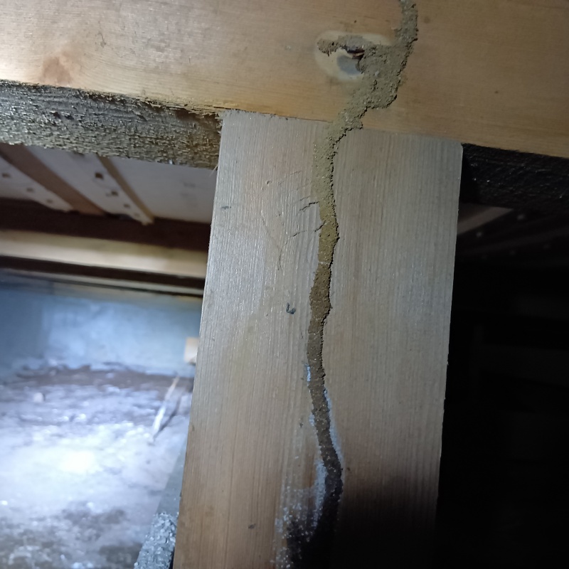千葉県千葉市若葉区の戸建て住宅にお住まいのお客様より、シロアリ駆除のご依頼をいただきました。 家の中に羽アリが発生したとのことでした。 室内で羽アリが見られる場合は、建物内にすでに大きな巣が作られ、被害が進行している可能性が高いです。 現地調査をおこなったところ、床下の木材にシロアリの侵入が確認されたため、被害拡大を防ぐための駆除施工を実施しました。