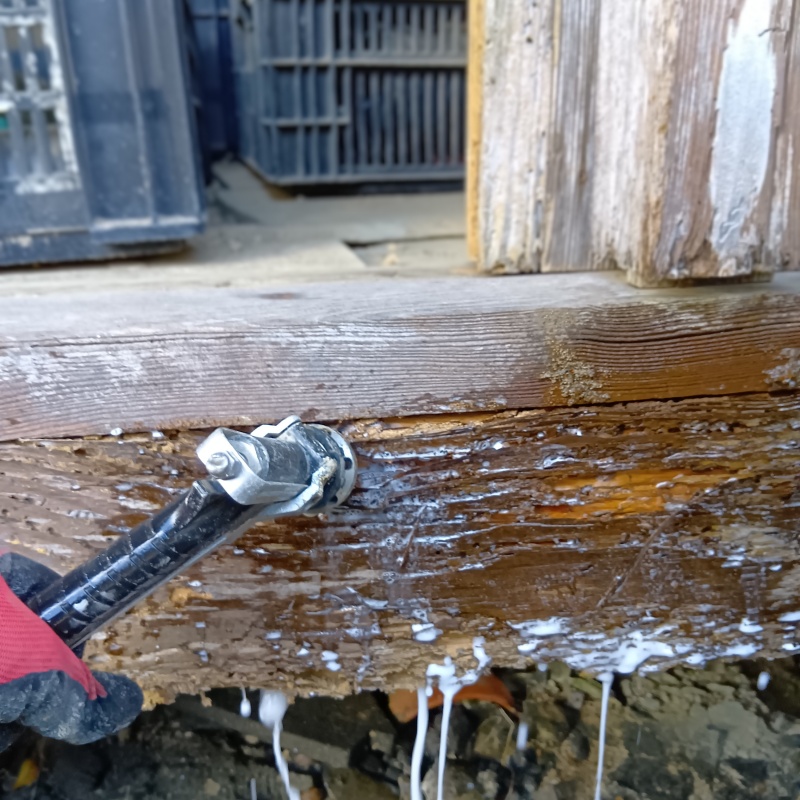 愛媛県宇和島市三間町黒井地の戸建て住宅にお住まいのお客様から、母屋と納屋のシロアリ駆除のご依頼をいただきました。 現場を確認したところ、床下の木材にシロアリの通り道である蟻道が作られており、木材の一部に食害が進んでいる状況でした。 シロアリは一度住み着くと木材をエサとして食べ進め、建物の強度を損なう原因にもなります。 被害がこれ以上拡大しないよう、速やかにシロアリ駆除の施工を実施することになりました。