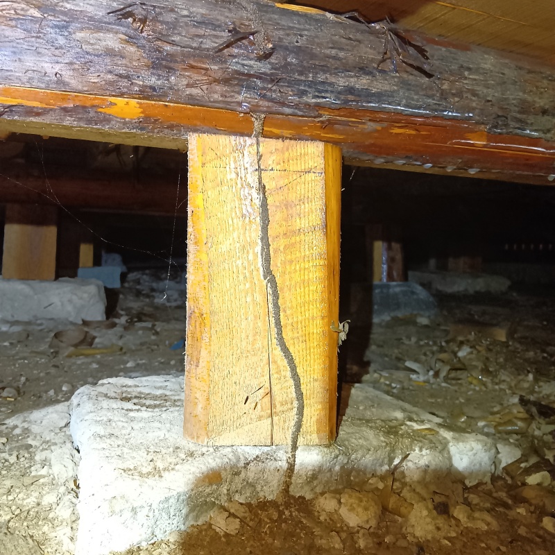 福井県福井市の戸建て住宅にお住まいのお客様から、シロアリ駆除のご依頼をいただきました。 リビングにシロアリが発生しているとのことでした。 現地調査をおこなったところ、床下の柱が食害によってボロボロになっており、シロアリが作った通り道である蟻道(ぎどう)も確認されました。 すでに被害が進行している状況だったため、早急な駆除と対策を実施することになりました。