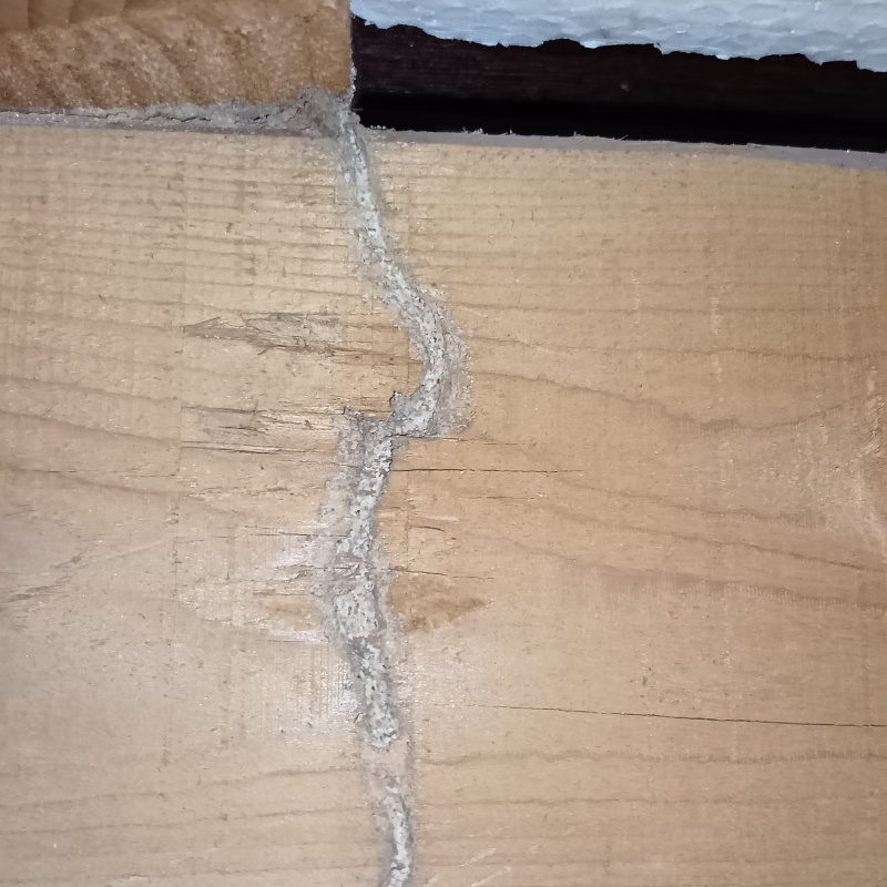 兵庫県加西市北条町北条の戸建て住宅にお住まいのお客様から、シロアリ駆除のご依頼をいただきました。 階段横の木材がボロボロになっており、小さなアリも見かけたとのことで調査を承りました。 現地を確認したところ、木材の内部が食害されており、床下にもシロアリが侵入した痕跡である蟻道が多数発見されました。 被害が建物全体に広がるのを防ぐため、全階を対象とした徹底的な駆除と予防の施工を実施することになりました。