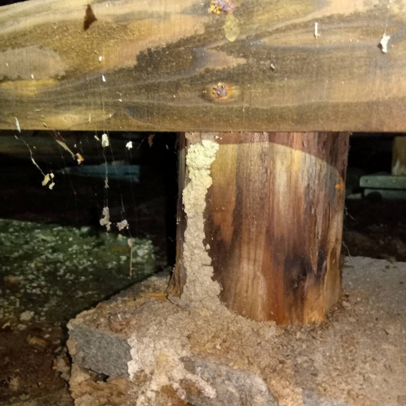 滋賀県草津市矢橋町の戸建て住宅にお住まいのお客様から、シロアリ駆除のご依頼をいただきました。 浴室や脱衣所など水回りのリフォームをおこなった際、業者の方から木材がシロアリに食べられていると指摘を受けたとのことでした。 現地調査の結果、床下の柱にはシロアリが移動経路として作る「蟻道(ぎどう)」がはっきりと確認されました。 被害状況から早急な対応が必要と判断し、徹底した駆除施工を実施しました。