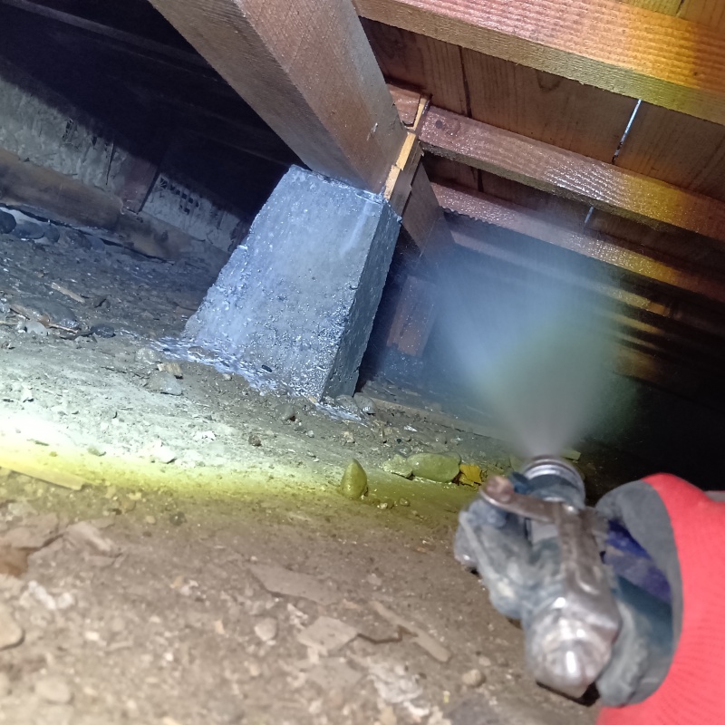 静岡県袋井市豊沢の戸建て住宅にお住まいのお客様から、シロアリ駆除のご依頼をいただきました。 床下や畳がシロアリに食害されているのを見つけ、不安になってご相談をいただいたとのことです。 現地調査をおこなったところ、床下の木材にシロアリの被害が確認されました。 建物は築76年と大切に住み続けられてきた木造住宅ですので、これ以上食害が広がって住まいの強度が低下しないよう、徹底した駆除と予防の施工を実施しました。