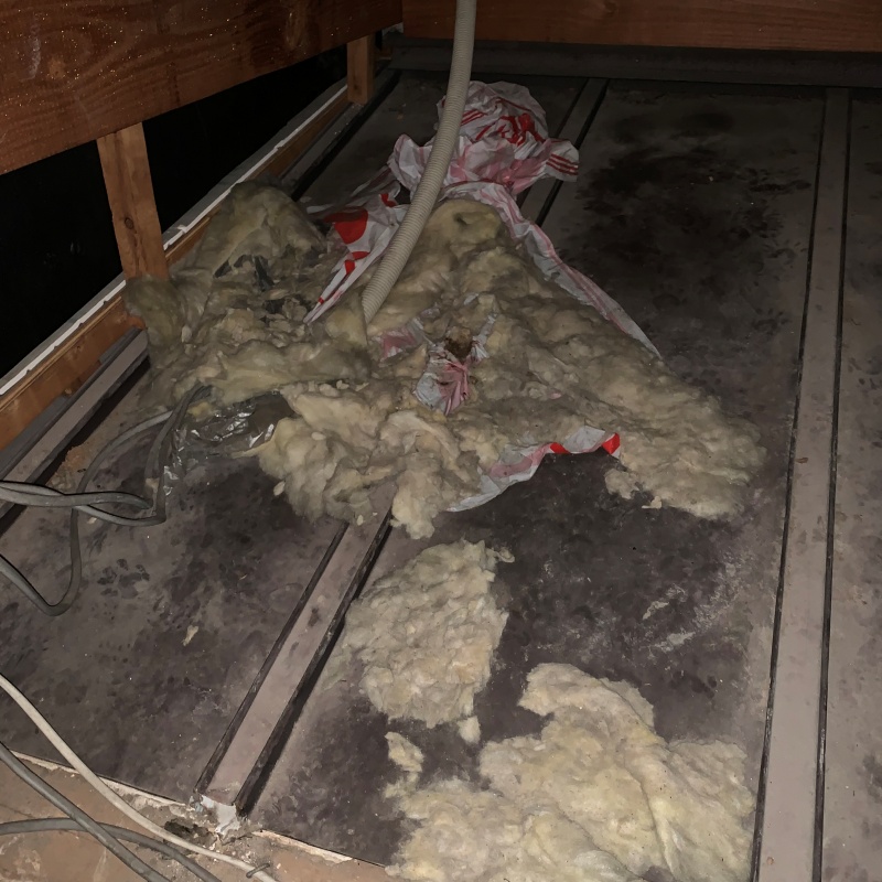 愛知県津島市神守町の戸建て住宅にお住まいのお客様から、アライグマ駆除のご依頼をいただきました。 浴室の天井から激しい物音が聞こえ、現在も鳴き声が聞こえるとのことでした。 現地調査をおこなったところ、屋根裏の断熱材が激しく荒らされて散乱しており、アライグマが営巣していたことは明白でした。 放置すれば建材の腐食や衛生被害がさらに深刻化するため、早急に駆除と再発防止の施工を実施することになりました。