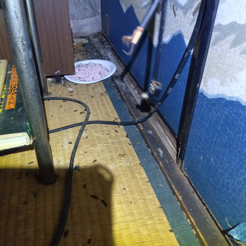 岡山県津山市の戸建て住宅にお住まいのお客様から、ネズミ駆除のご依頼をいただきました。 部屋全体でネズミの姿を目撃し、多数のフンも見つかったとのことでした。 現地調査をおこなったところ、畳の上に散乱したフンとともに、建物の経年劣化によるすき間が多数確認されました。 広範囲で活動している可能性が高いため、徹底的な駆除とあわせ、長期的な安心を見据えた再発防止対策を講じることとなりました。